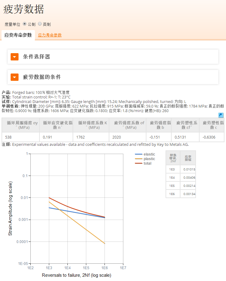 最大的应变寿命和应力寿命曲线数据库,提供超过 35000 种材料在各种热处理状态和负载条件下的 e-N 曲线和 S-N 曲线。在适用的情况下还提供的材料单调性质和统计疲劳参数做为参考。