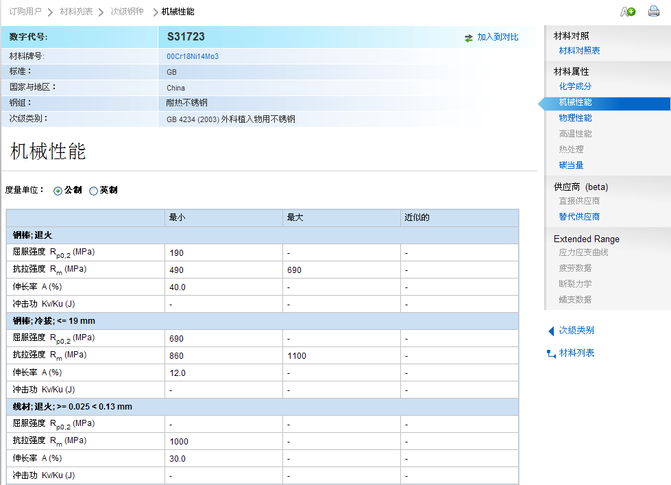 Total Materia从金属性能搜寻你可透过输入名称、国家/标准、种类、标准编号、 化学成分、机械性能、其他性能或以上任何组合就可方便快捷地搜寻超过6百万种金属性能。例如:查看需要有C < 0.05, Cr > 16%, Ni > 8%, 张应力超过 750 MPa的中国不锈钢。 于主页按下进阶搜寻按钮。然后于国家/标准列选择中国/GB。检查不锈钢的选行然后输入所需的钢性能及合金元素。 当屏幕出现搜寻结果, 就可在列表中选择所需的钢以查阅它的性能。在这例子我们会先选择S31723。 按下材料后, 就会出现一列子群。在In Total Materia, “子群” 指钢性能的标准规格。在这例子中, 我们选择了GB/T 4234 的说明。注意不同的规格会有轻微不同的性能定义。 在Total Materia数据库金属性能包括了它的成分, 交叉引用表, 机械性能, 物理属性, 蠕变及疲劳特性。按下列的例子放大。 |