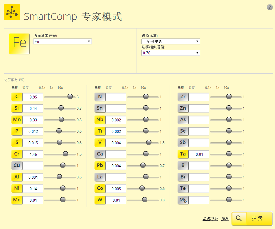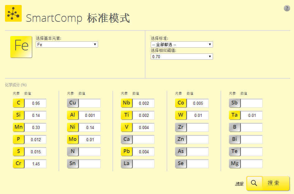 SmartComp 作为 Total Materia 的高级模块,可以根据从光谱仪或其他来源获得的化学成分迅速给出金属材料的牌号,非常适合材料检测、未知材料判定和竞品分析。