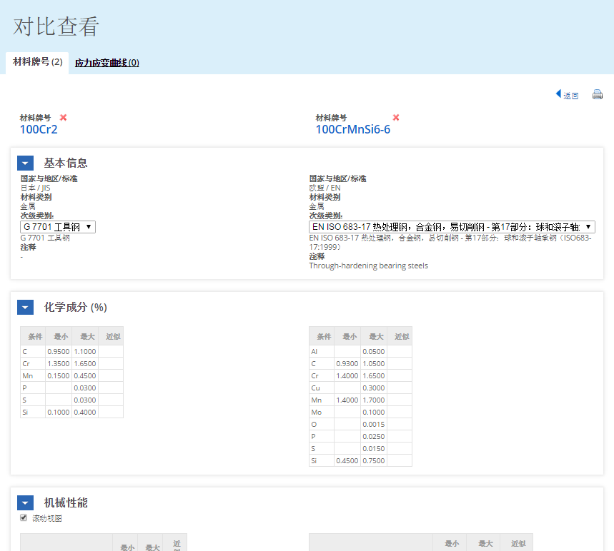 识别和匹配材料有时只是工作的一小部分。 Total Materia 材料数据库还允许从匹配材料列表直接访问材料的详细性能数据,从而提供了对候选材料及其性能进行更详细比较的可能,包括一对一的并列对比以及使用材料对照表和 SmartCross 2 功能同时比较材料的化学成分和机械性能。