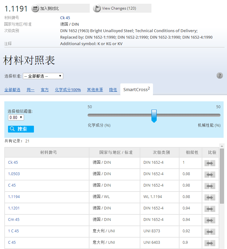 通过全球独一无二的专利技术,可以根据化学成分、机械性能或两者的组合来快速找到近似替代材料。您还可以设置化学成分和机械性能的权重。近似材料会按照近似性的高低来排列,还可以一键对比查看近似材料的异同。